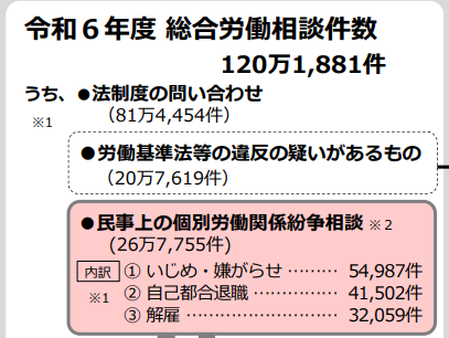 実際に、厚生労働省が公表した令和6年度の労働相談に関するデータでは、最も多い相談内容が、パワハラなどの「いじめ・嫌がらせ」(54,987件)に関する内容でした。