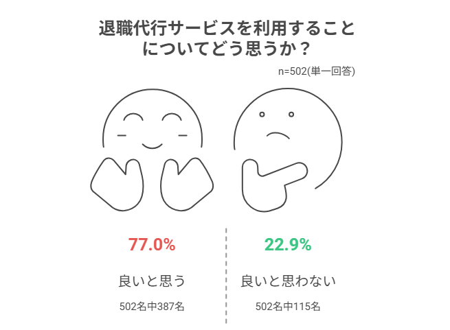 実際に、株式会社ドリームプランニングの調査によれば、退職代行サービスを使うことに対して「良いと思う」と答えた人が77.0%もいました。