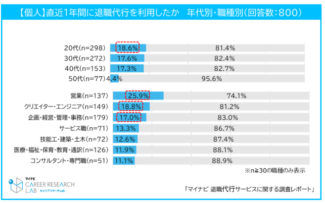 また、営業職やエンジニア・クリエイター職、管理職などでの利用が目立ちます。人手不足が深刻な職種が多く、責任感の強さから退職を切り出しにくい傾向があります。
