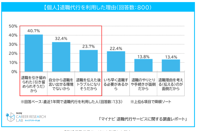 退職代行を利用する理由で最も多いのは「退職を言い出しにくく、引き留められるため」です。トラブルになることを懸念した人も多く利用しています。